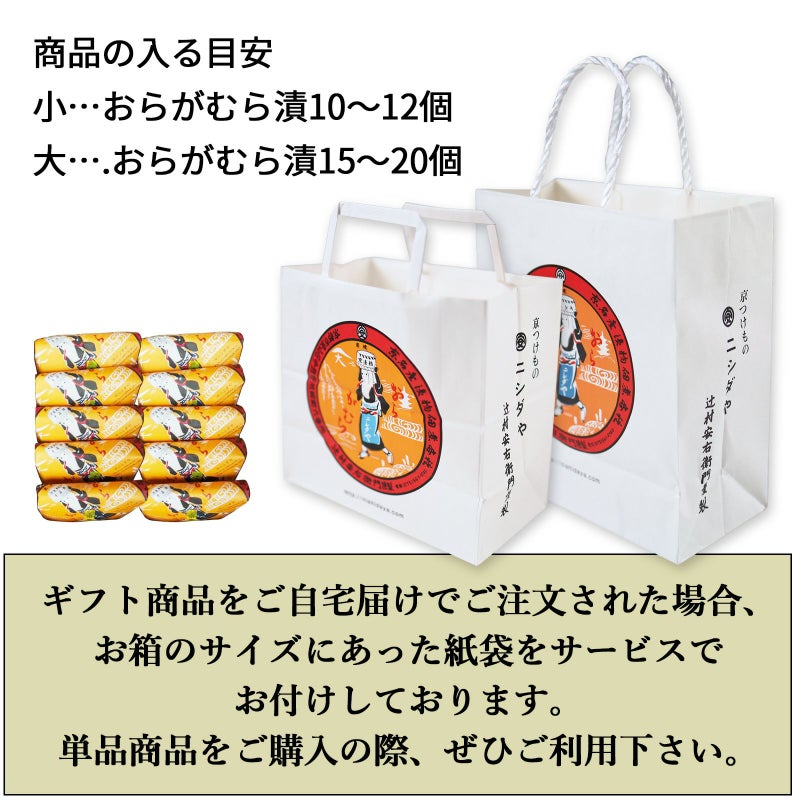 ギフト商品をご自宅届けでご注文された場合、お箱のサイズにあった紙袋をサービスでお付けしております。単品商品をご購入の際、ぜひご利用下さい。