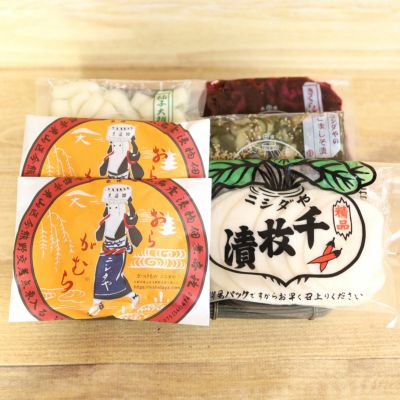 熊本の 知人を訪ねる折りに、相手方宅に送っていただきました。 先方は、農産物の卸を経営され、目が肥えておられるので、信頼できる、ニシダヤさんにお願いしました。お好みがわからないため、詰め合わせを選びました。しばづけと、千枚漬が、特にお気に召したようです。
